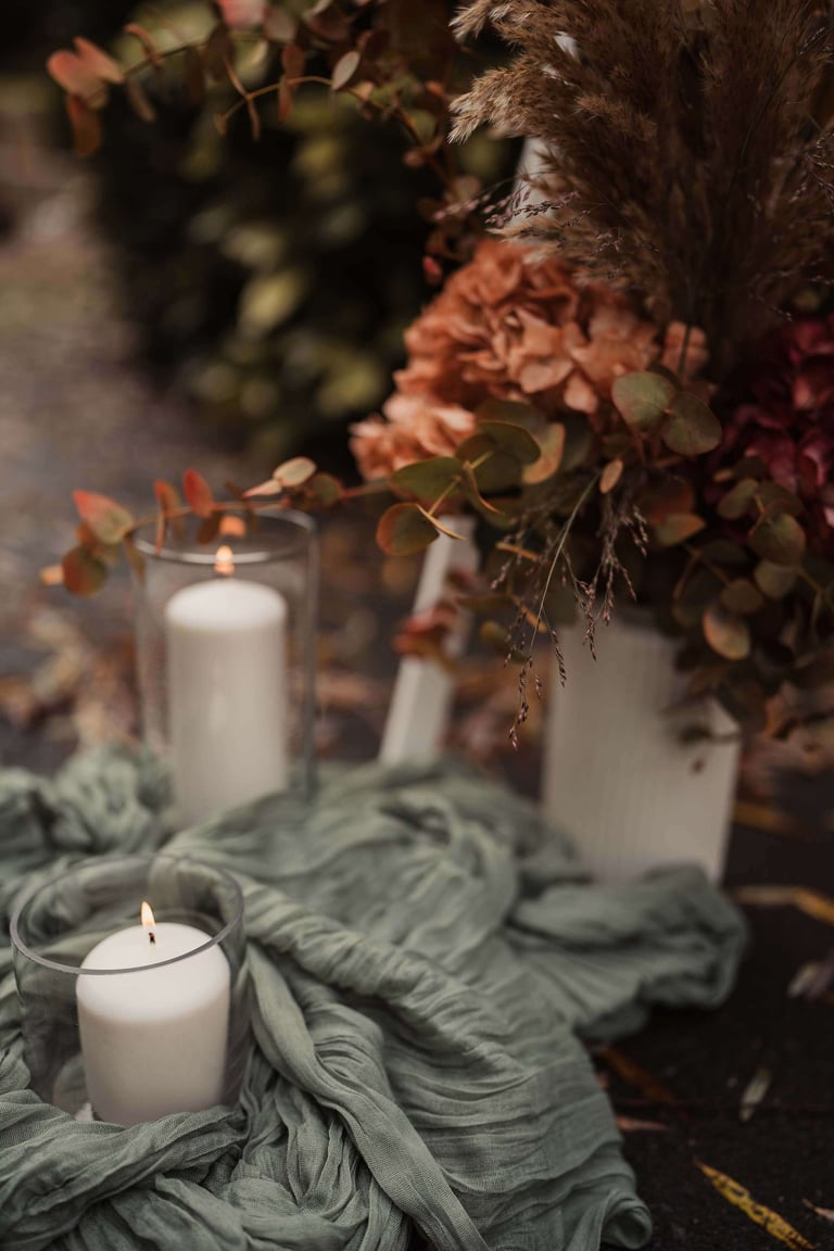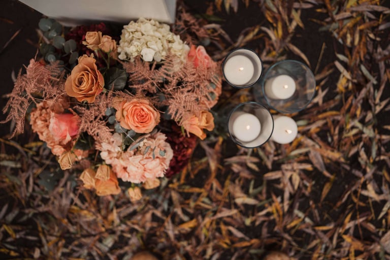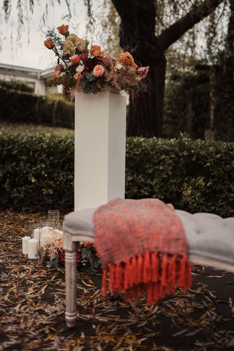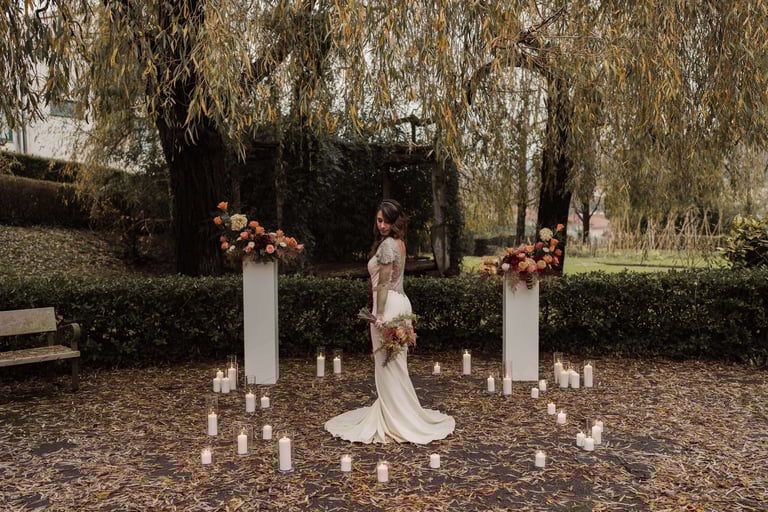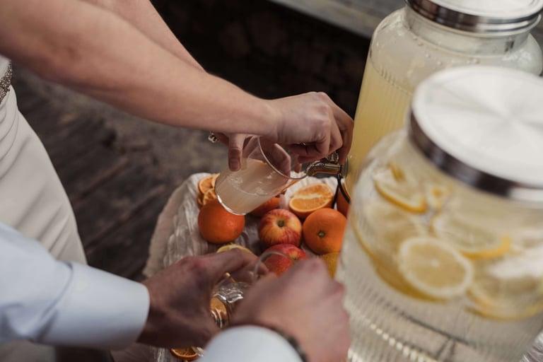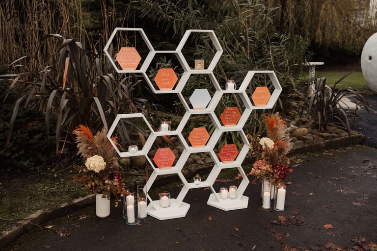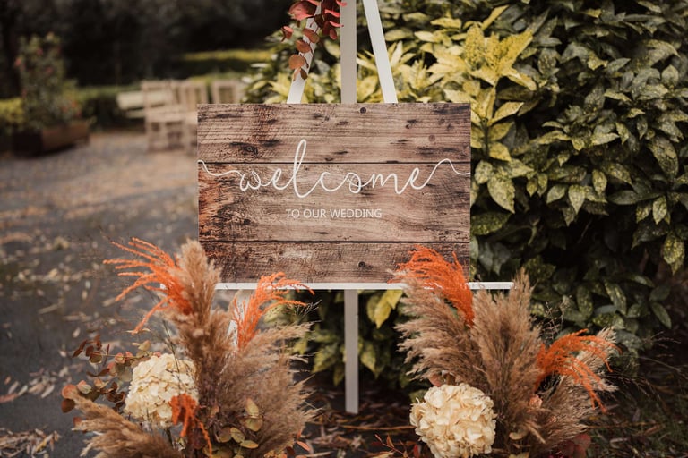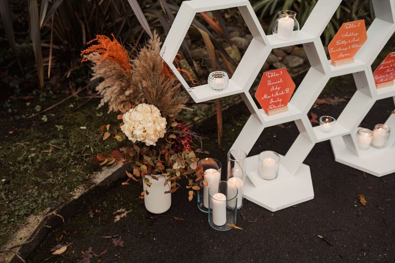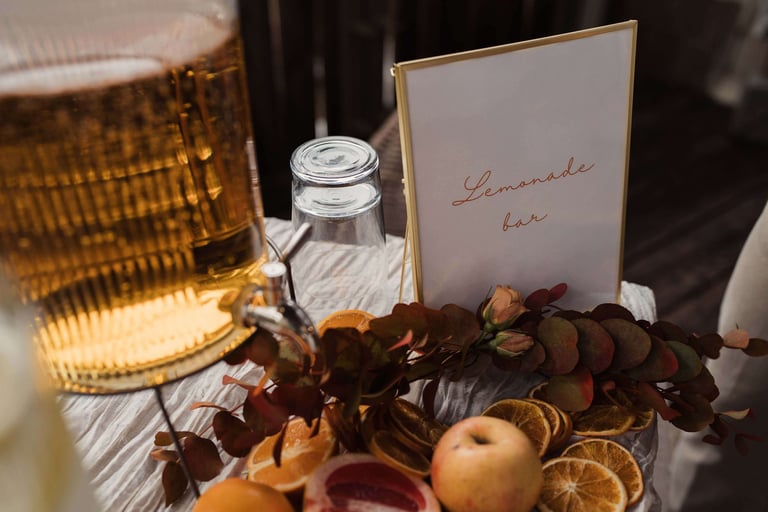 En lo referente a la decoración, nos encargamos del rincón de bienvenida, el seating plan y de la zona de limonadas, siempre siguiendo el mismo estilo que evoca al otoño.