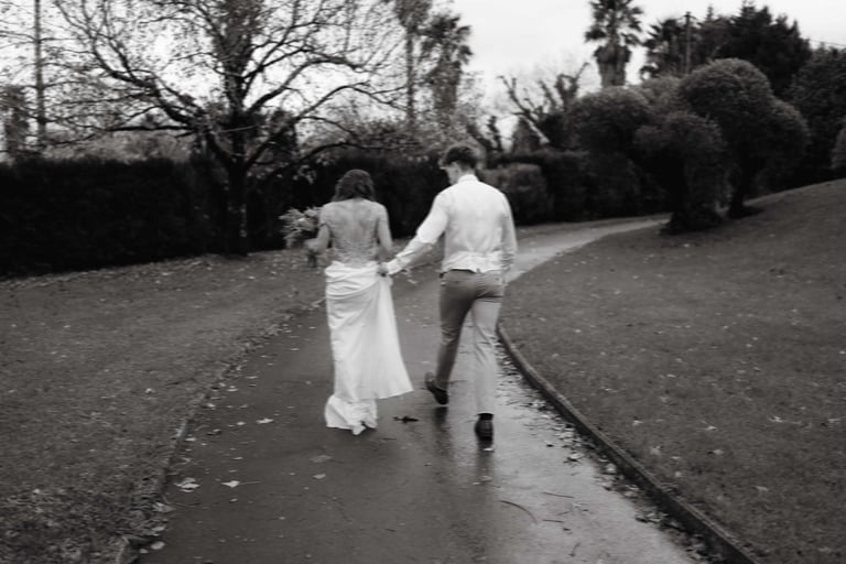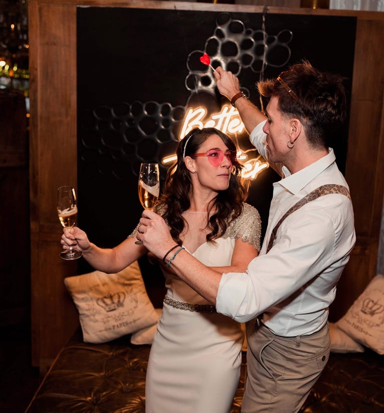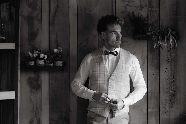 El novio comenzó informal desde el principio, con pantalón de traje, camisa y chaleco, que luego transformó en un look más “canalla” con unos tirantes estampados para el momento de la fiesta. La pajarita de corcho y unos originales gemelos le dieron el toque divertido al look.