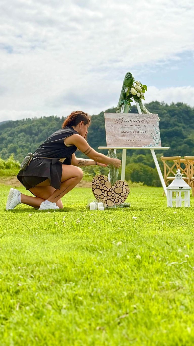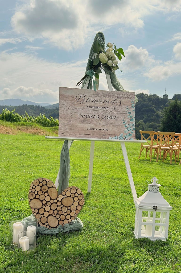 En el rincón de bienvenida nos encargamos de diseñar el cartel según las preferencias de la pareja, el cual estuvo acompañado de nuestro trípode blanco, velas grandes y una tela verde acorde con la paleta de color.