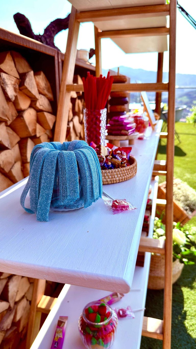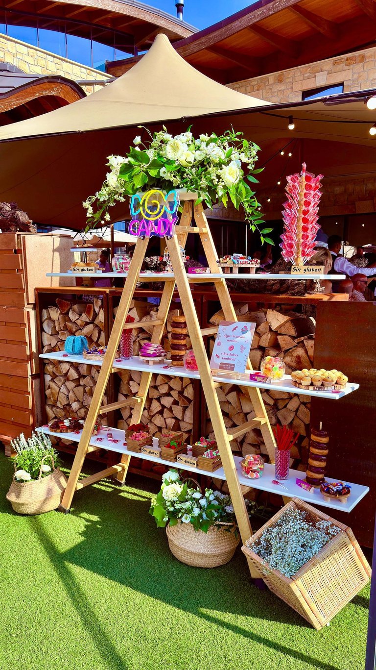 Dado que para los novios era muy importante que las flores lucieran lo máximo posible, decidimos reciclarlas casi íntegramente para el candy bar, donde coronaron nuestra escalera con baldas repleta de diferentes chucherías y bollería. Para los recipientes renunciamos al plástico y, siguiendo nuestra preferencia por los materiales naturales, priorizamos el uso de recipientes de madera y creamos el contraste con bomboneras de cristal. Para que los invitados celiacos pudieran disfrutar por igual de un bocadito dulce, elaboramos carteles que señalaban los alimentos sin gluten. Aquí también diseñamos un cartel personalizado para la pareja, a juego con los tonos de todo el candy bar.