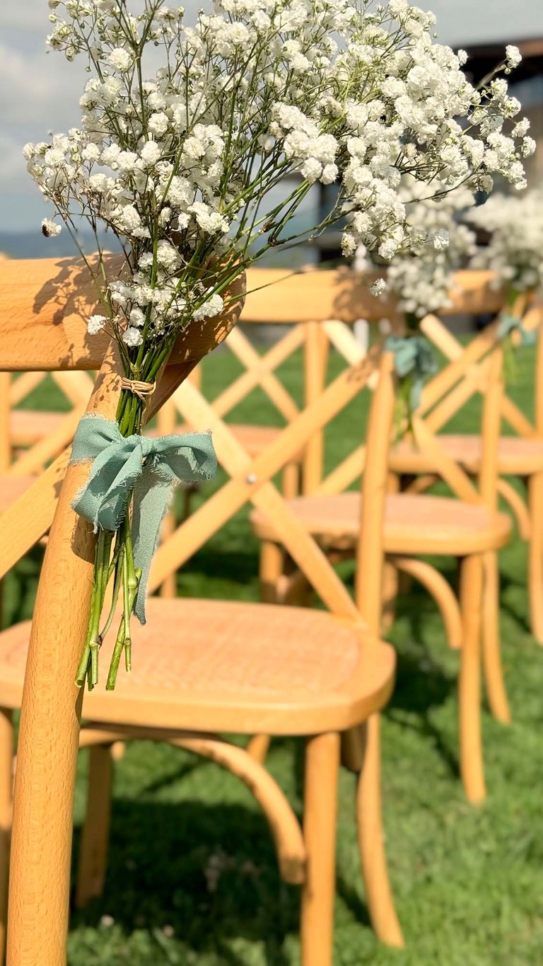 Para las sillas, preparamos ramitos de paniculata con cinta de raso verde que le dieron un toque especial a la entrada de la pareja.