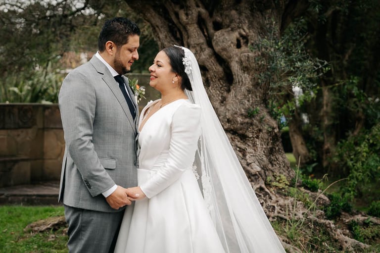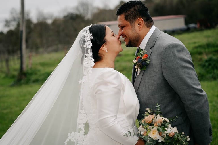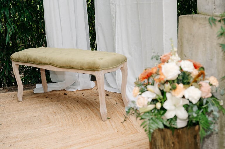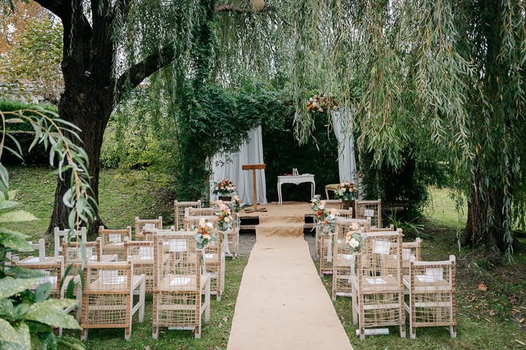 El lugar elegido por esta maravillosa pareja fue la Sidrería Araeta. Allí, el tiempo dio una tregua y nos permitió celebrar la ceremonia al aire libre en sus preciosos jardines, amenizada por violín y piano en directo y enmarcada por una decoración sutil, pero muy elegante. Para el proyecto decorativo partimos de un concepto romántico con las rosas y los tonos pastel como protagonistas. Así, encargamos tres hermosos centros para el altar, que ya de por sí lucía espléndido con sus verdes y un banquito tapizado a juego; para el pasillo, los novios se decantaron por sencillos ramilletes de rosas.